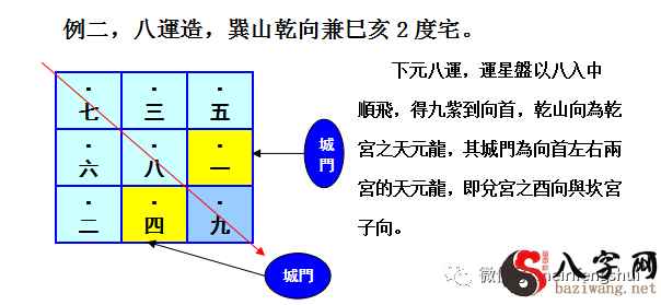 城門,在陰宅的立穴定项上尤為关键。因为陰宅并不是以旺山旺向為重,只是以得水為上,藏風其次,城門是陰宅得水的喉部要沖,為穴內進氣的原則所属,若旺星飛臨城門,意味着穴納旺氣,是极趣家,即使其他宮位為衰星飛臨,还可以化凶為吉。但一旦當旺元運過去,待衰星飛臨城門時,則一落千丈,凶禍發矣。